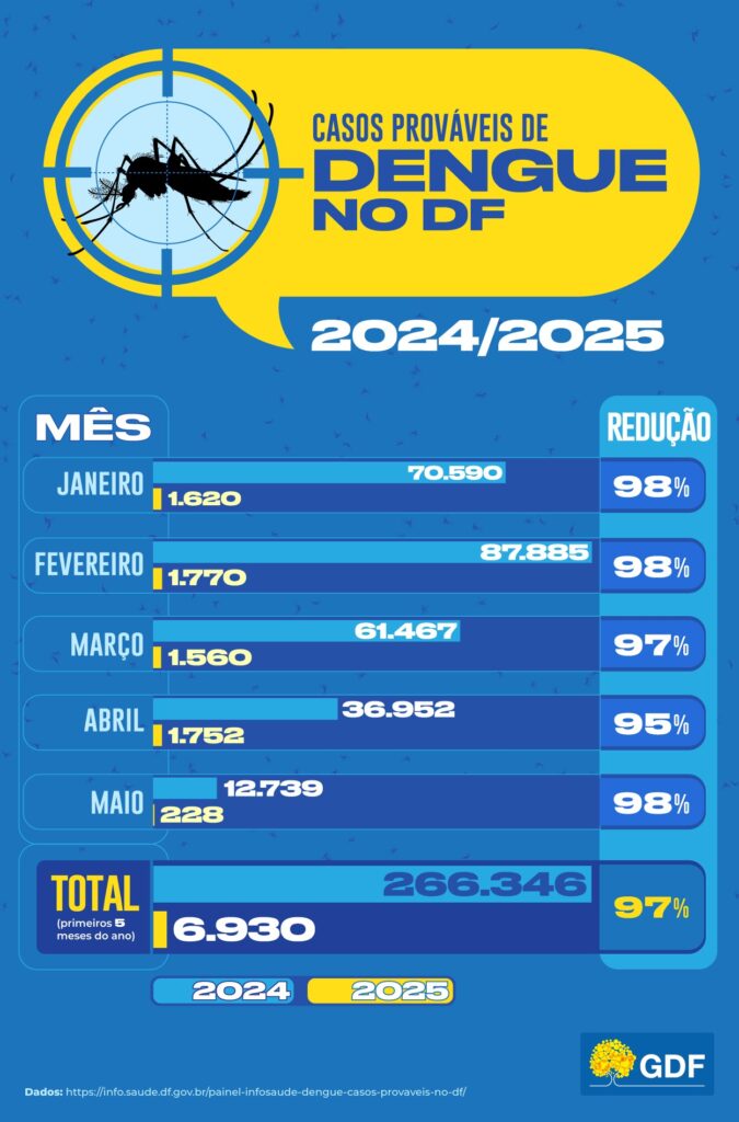 A queda está registrada no Portal de Informações da Saúde do DF (InfoSaúde-DF), que aponta a diminuição nos primeiros meses de 2025 em comparação com os do ano passado. Entre janeiro e maio de 2024, foram registrados 266.346 casos prováveis de dengue, ao passo que em 2025, até o momento, foram 6.930 casos – uma redução de aproximadamente 97% do valor.