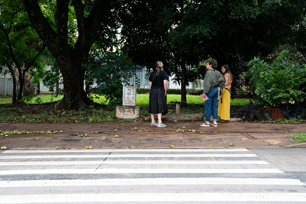 Ao longo do trajeto, os participantes acessam áudios por meio de QR codes distribuídos em um mapa, com cenas, textos, depoimentos e paisagens sonoras inspiradas nas histórias e tensões do próprio território. A experiência é ao mesmo tempo individual e coletiva: cada pessoa utiliza fones de ouvido, mas compartilha o percurso e a escuta com o grupo. A recomendação é levar telefone celular carregado, fones de ouvido e, se possível, guarda-chuva.