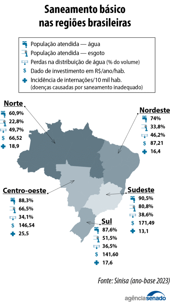 As disparidades são ainda maiores quando se avalia as diferentes regiões do Brasil: no Norte, a média de investimento anual é de R$ 66,52 por habitante e, no Nordeste, de R$ 87,21 — muito abaixo dos R$ 171,49 registrados para o Sudeste. Os dados são do Sistema Nacional de Informações em Saneamento Básico (Sinisa – 2023).