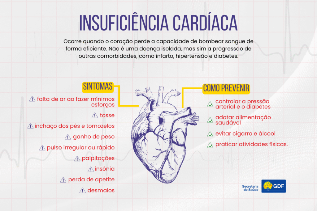 Entre os principais sintomas estão falta de ar (especialmente ao deitar ou durante esforços leves), cansaço intenso, inchaço em pernas e tornozelos e ganho repentino de peso por retenção de líquidos, além da sensação de estômago cheio e perda de apetite.