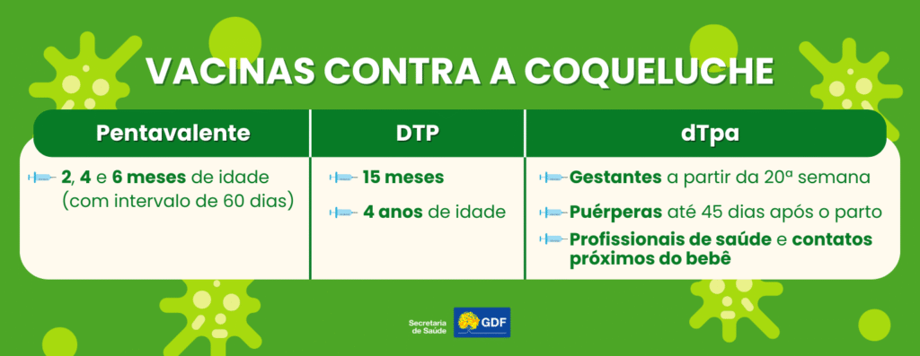 “A vacina tríplice bacteriana acelular [dTpa] é indicada a partir da 20ª semana de gestação e protege contra coqueluche, difteria e tétano. Caso a gestante não tenha recebido a dose durante a gravidez, ela pode ser aplicada até 45 dias após o parto”, explica Tereza Luiza Pereira, gerente da Rede de Frio Central da Secretaria de Saúde do Distrito Federal.